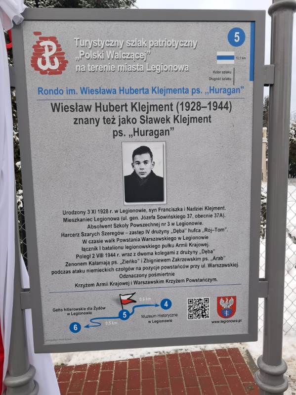 12 stycznia w Legionowie odbyła się uroczystość odsłonięcia tablicy pamiątkowej poświęconej Wiesławowi Hubertowi Klejmentowi ps. „Huragan” — harcerzowi Szarych Szeregów i żołnierzowi Armii Krajowej, związanemu z historią miasta. Bohater urodził się i wychował w Legionowie, a do konspiracji wstąpił jako bardzo młody człowiek. W sierpniu 1944 roku wziął udział w Powstaniu Warszawskim na terenie Legionowa. Poległ 2 sierpnia 1944 roku, przenosząc meldunek pod ostrzałem niemieckich czołgów. Miał niespełna 16 lat.